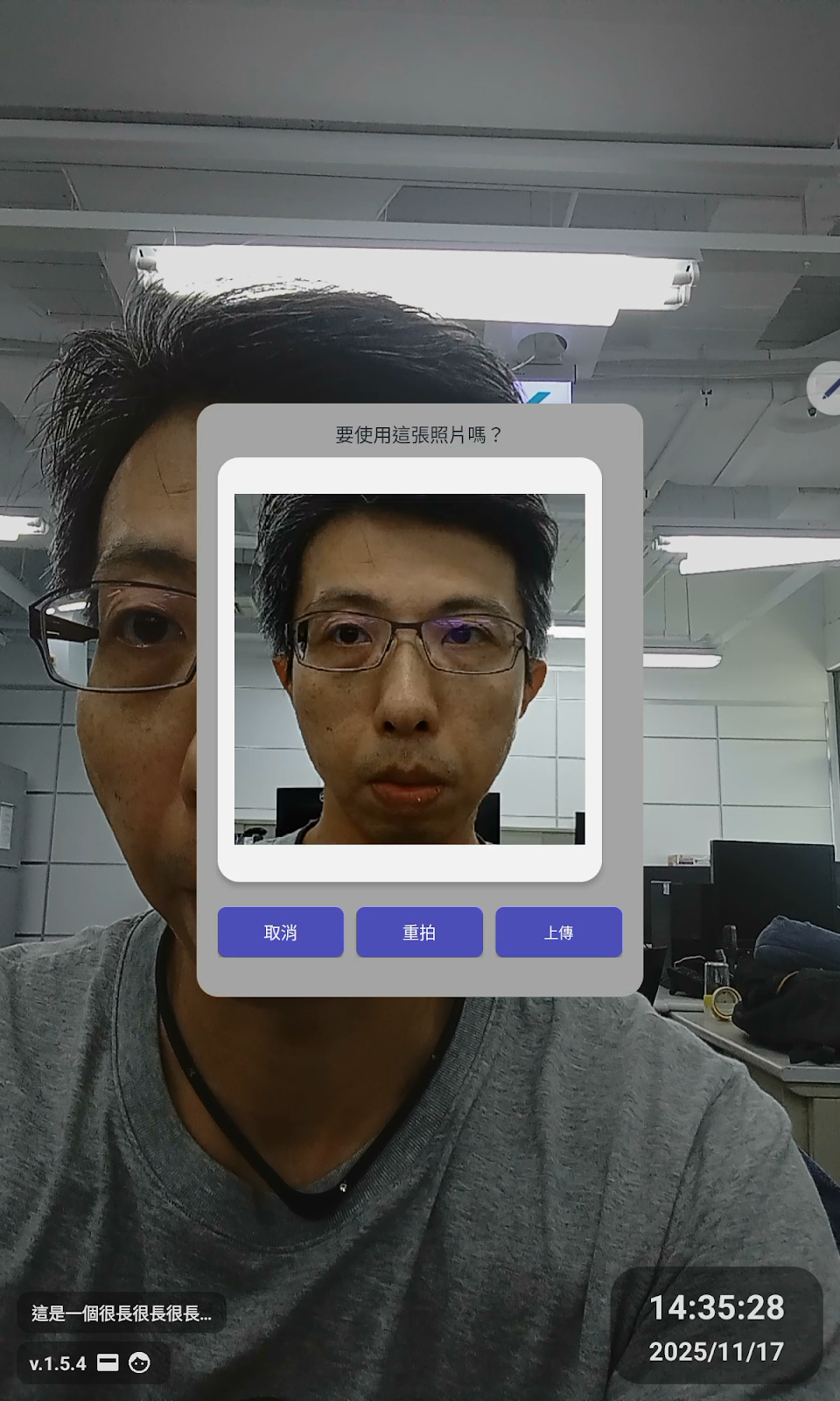 接着,白色椭圆导引框内会开始 3、2、1 倒数。倒数结束时,镜头会拍摄您当前脸部的一张照片。然后会跳出一个对话框,询问您是否要直接上传此照片。在此对话框中,您可以选择 重拍(3、2、1 倒数会重新开始),或选择取消新增照片操作。若选择上传,在服务器接受您的上传请求后,将会显示「新增照片成功」消息。