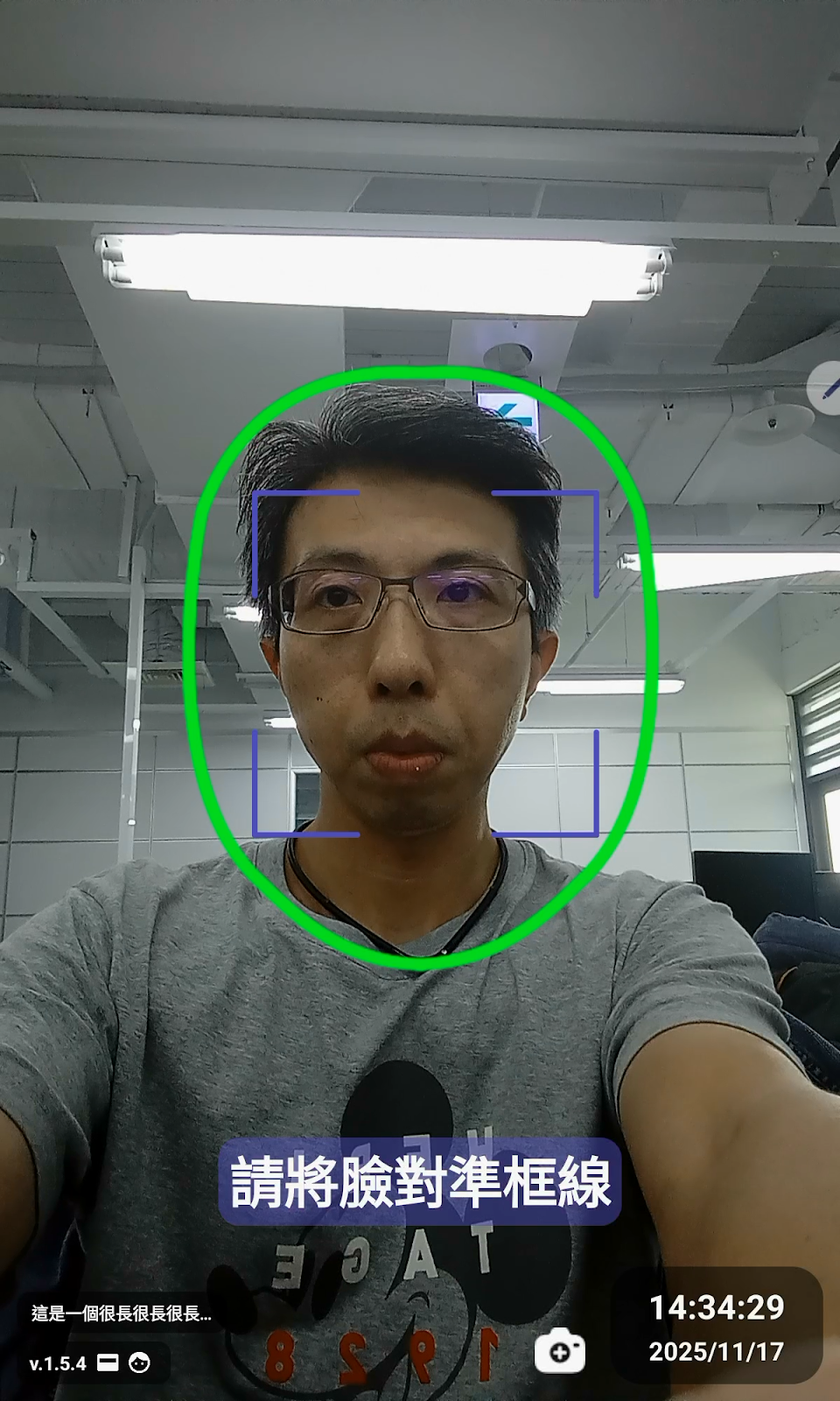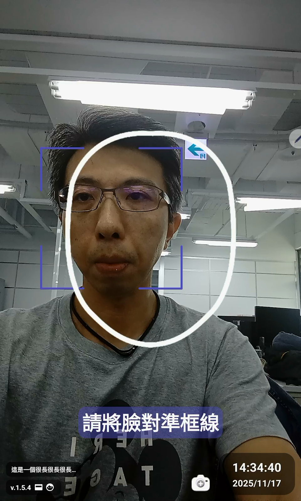 当 App 判断您的脸部与镜头距离适中,且头部转角位于中立位置时,App 会撷取您脸部的画面,并将其传输至服务器进行人脸识别。此时,原本白色椭圆形的导引框会变成荧光绿色。